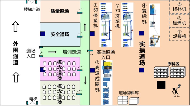 遠東大學生產學院致力于打造行業內首家一線員工實訓道場,道場分為概念道場、安全培訓區、質量培訓區及精益實操道場四大培訓區域,旨在為公司培養具有發現問題、改善問題的能力、并掌握高水平實操技能的員工。概念道場即理論培訓道場,以傳統課堂式、案例研討式、課題式等培訓方式,對參訓學員從思想認知方面進行工藝理論等知識的教學;安全道場結合人、機、料、法、環,設計危險源識別及預防相關道具,通過安全事故案例進行安全教育;質量道場以質量事故案例警示教育和質量問題產品展示為主,通過系統性的質量培訓,培養員工的質量意識,提高員工對產品缺陷的識別能力;精益實操道場主要通過情景模擬教學形式,以道場內的設備進行設備維護、自主保養、快速換模、標準化作業等培訓內容,是員工理論培訓與實際操作相結合的堅實平臺。